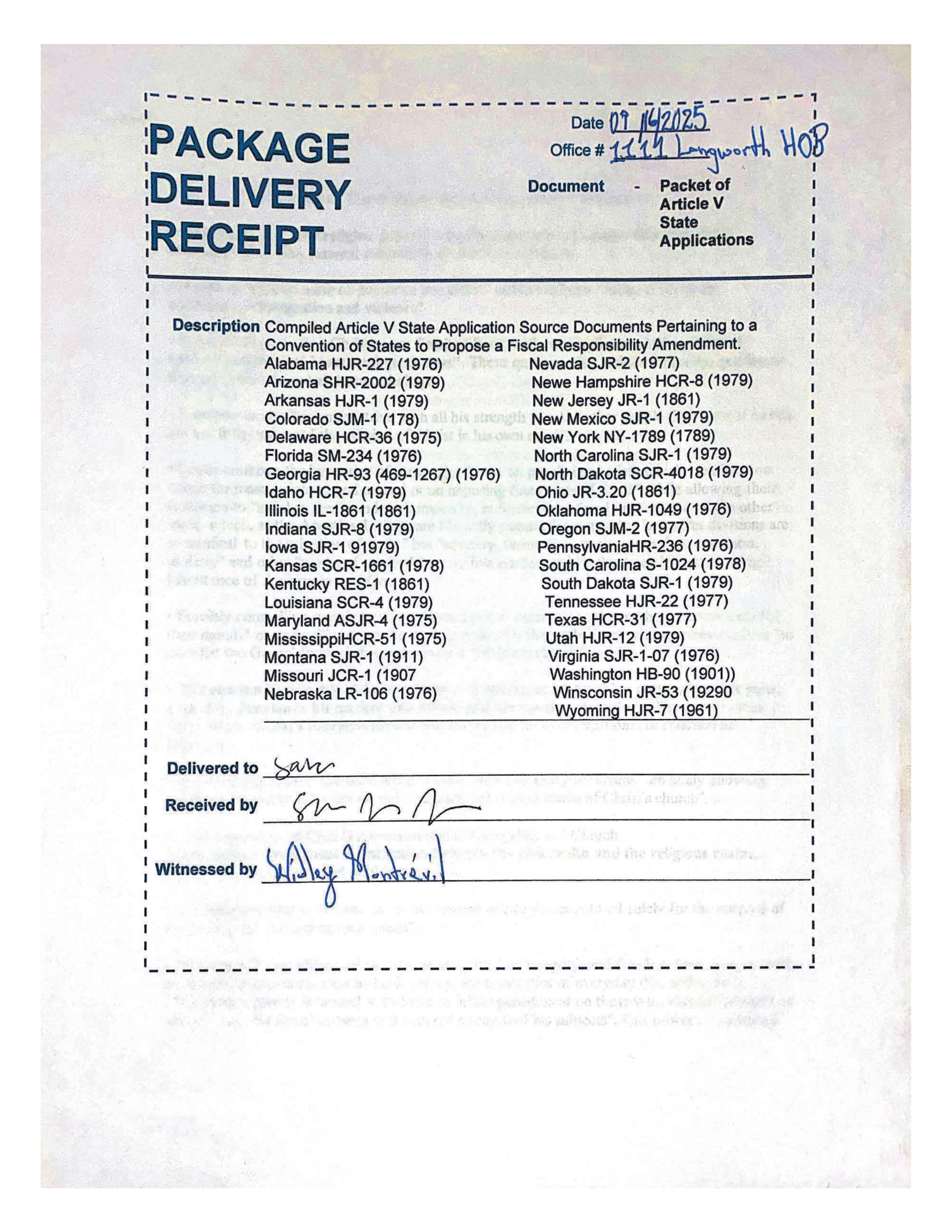 On or about September 14, 2025, a packet containing 39 applications for a convention of states were delivered to Congress (office of Rep. Jody Arrington) and the signed receipt is shown here.