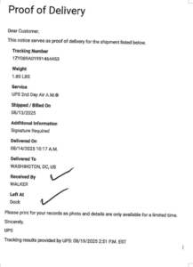 Subject: RE: Tom Llewellyn – Package delivery receipt 8-14-25